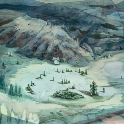 In producing her work, Kashihara references classic techniques of traditional Western Painting, first applying her own formula of semi-oil based paint as an undercoat to the canvas. Upon this original canvas, she uses oil paint applied in a thinly diffused manner reminiscent of Japanese nihonga painting, while also incorporating mixtures of tempera to create a unique depth of color. Within the world of her works, scenes from both reality and the spaces of inner imagination gently coalesce and are interwoven. In the backdrop of these works is Kashihara's interest in the 'distance' between the internal and external, as an artist who left Japan and moved to Germany where she has since continued to develop her practice. Distance in this context includes they physical distance between Japan and Germany, the spiritual distance between the respective cultures, and the distance between herself as a Japanese person and herself while in Germany. Such introspective explorations are symbolically expressed through motifs of caves, holes, mountains and lakes, which she repeatedly takes up within her work. Through this process of sublimation, she further serves to evoke the fundamental energies in nature that lie dormant within the great depths of the earth.