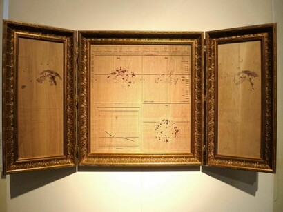 The Korean artist Amy Cheung presents “Imagine Hero" (2013) which is the result of collaboration with the American psychologist Philip Zimbardo, creator of the legendary Stanford Prison Experiment, who also found Heroic Imagination Project (HIP) in 2010. HIP is a non-profit association that - through scientific approach and using social psychological strategies in research and education - try to develop a new concept of heroism intended as a daily exercise to encourage positive actions. In this way, HIP wants to overcome the human natural inclination that tends toward a passive observation of the surrounding events. "Imagine Hero" was created to contribute to the fundraising campaign promoted by HIP and the proceeds of the sale of the artwork will be entirely donated to HIP association. "Imagine Hero" is composed of a triptych showing the scans of the brain waves of both the artist and Prof. Zimbardo while they were imagining heroes: for the artist – a Chinese Hero, and for Prof Zimbardo an American Hero. In the central panel there is a combination of both brains while they were absorbed in the construction of an ideal Platonic Hero, understood as the positive essence of a new form of heroism. The engraving was made directly onto the wooden panels from the fMRI data yet the "active areas" of the heroic action in their thoughts were revealed to us through the artist and Prof. Zimbardo's blood, as they believed in the extreme case, heroes give their blood for the cause.