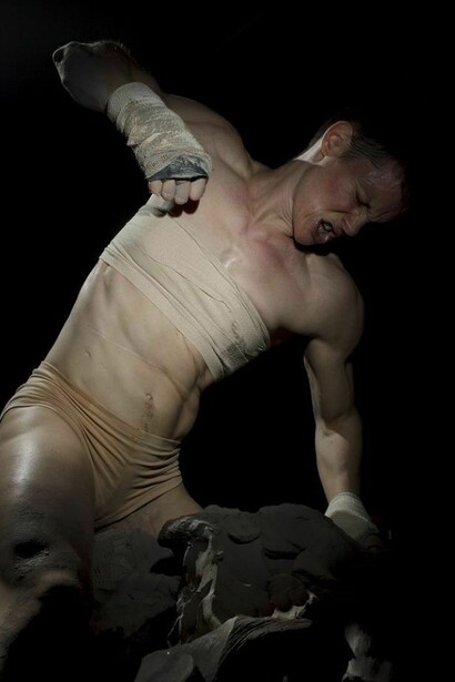 In the video Hard Times, another work based around the myth of Tiresias, the artist performs wearing a prosthetic mask, a frosted blonde wig, and the deep bikini tan of a female body builder, posing in slow motion atop a wooden plank precariously hovering over an audience. Body building is a sport with no other purpose than to present a “perfected” surface. Cassils sees the construction of this unsustainable body as a metaphor for America’s insatiable appetite and the drive of capital regardless of consequence. Hard Times is a portrait of a social body rotting from the inside out. Drawing on feminism, body art, gay male aesthetics, and Hollywood cinema, Cassils creates a visual language that is at once emotionally striking and conceptually incisive.