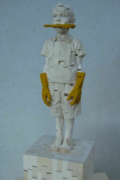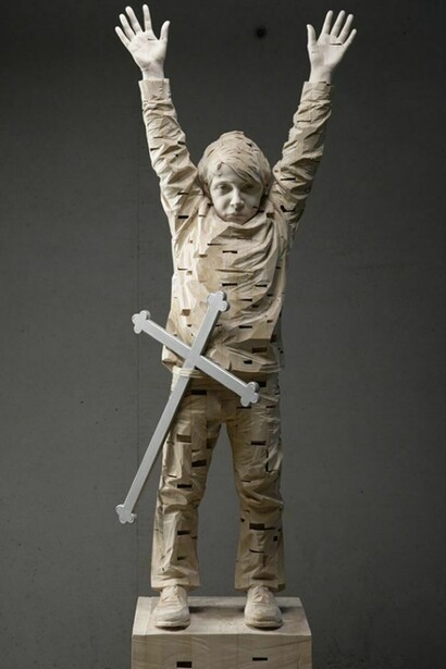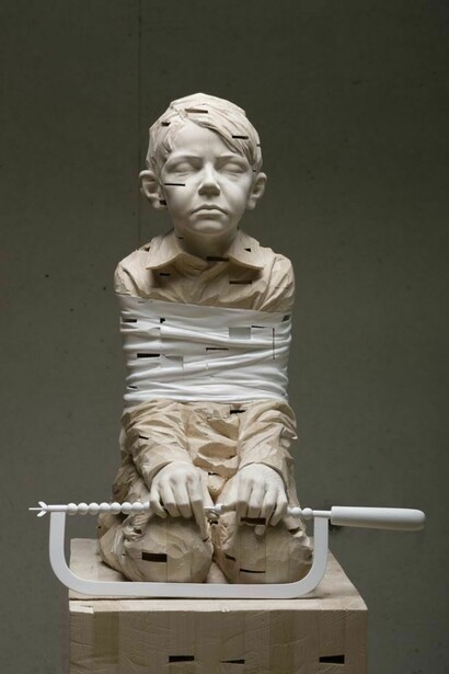 The Tyrolean Gehard Demetz creates fascinatingly detailed sculptures and objects from basswood. Particularly his figures of children, confronting the viewer with blank eyes and in provocative poses, show his very own and strong artistic imagery. Most of the children are endowed with different attributes in an oppressive way: A young pinioned boy holds a saw in his hands, another raises his empty hands high above his head, wearing on his belt a cross like a gun. Demetz's works question the value system of our society today, as the artist puts religious symbols and everyday objects into new contexts, thus creating new meanings.