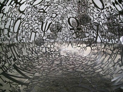 Letters from world alphabets literally form the connective elements in Talking Continents, the multi-part stainless steel installation in the main gallery. This series of suspended sculptures are hand-assembled from die-cut letters of nine international alphabets, the shapes of which the artist finds very beautiful. The letters work to form a more complex figure that is not a singular individual but rather a universal embodiment of humanity. Talking Continents creates a place where people are encouraged to meet, observe, and contemplate while engaging in a dialogue that inspires inward reflection and also a sense of global unity. The idea of continents and their interconnectedness has accompanied Plensa’s work from the beginning. In the darkened gallery space, each work is illuminated to create striking light and mysterious shadows.