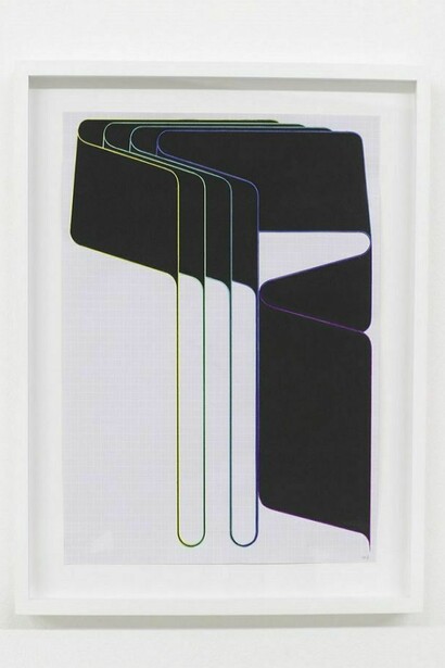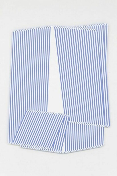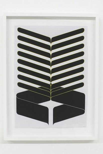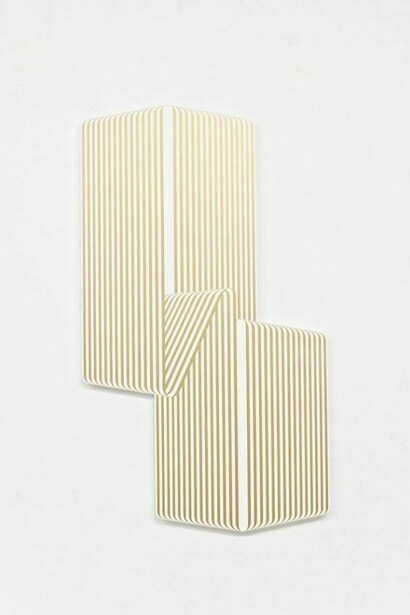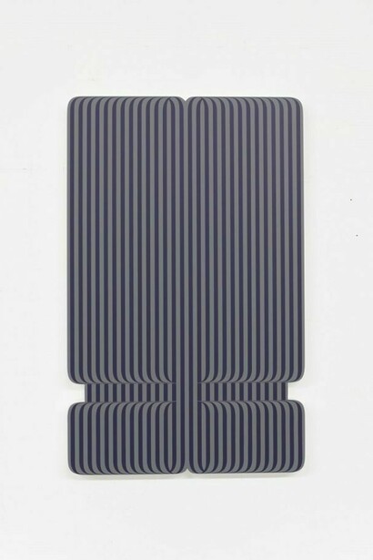 Terry Haggerty’s paintings and large-scale wall drawings are rooted in Minimalism’s elimination of non-essential forms, and in the phenomenology of optical illusion and perception put forth by Op art. The British-born artist, who currently lives and works in Berlin, is known for a body of work that Rosalind Krauss has referred to as the tangible representation of a “centuries old face-off between line and color.” Two-dimensional surfaces are covered in serial patterns of light and dark stripes, forming geometric compositions of almost industrial perfection. The artist’s handiwork lies in the edges and center of the paintings, where Haggerty disrupts the lines’ abstracted mechanical forms and bends them in an opposing direction. This gesture gives the pristine, flat surfaces an illusory, three-dimensional quality. With prolonged viewing, the abstract forms seem to shift and oscillate.