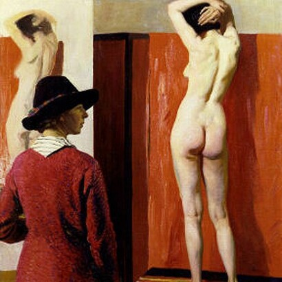 Before 1907, Knight lived in the artists' colony at Staithes in Yorkshire, along with her husband, the artist Harold Knight. The couple later moved to Newlyn in Cornwall and became a part of the Newlyn School of artists. Newlyn was renowned for its quality of light and plentiful models in the form of the local fishing communities. The earliest portrait in the exhibition dates from 1913 and was painted during her time in Cornwall. Entitled Self Portrait, it shows the artist with a nude model, fellow artist Ella Naper.