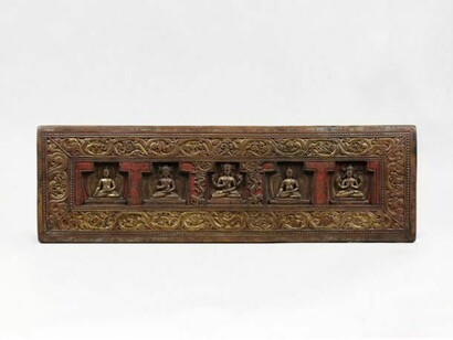 It is difficult to underestimate the importance to Tibet and the Buddhist faith of these types of classical manuscript covers. As objects that once acted as the entrance to, and enabled the protection of, sacred Buddhist texts, they are regarded as part of the Dharma (The Teaching), one of the Triratna (The Three Jewels – Buddha, Dharma and Sangha – meaning the community) and as such to be revered as greatly as one would the Buddha. They would have been specifically commissioned by monasteries or wealthy families to protect the sacred texts of the Buddhist canon, and fashioned from hardwood, a material difficult to obtain in Central Tibet, no expense was spared in their construction: often intricately carved, sumptuously painted and gilded, they are the products of the finest early Tibetan craftsmanship and artistry.