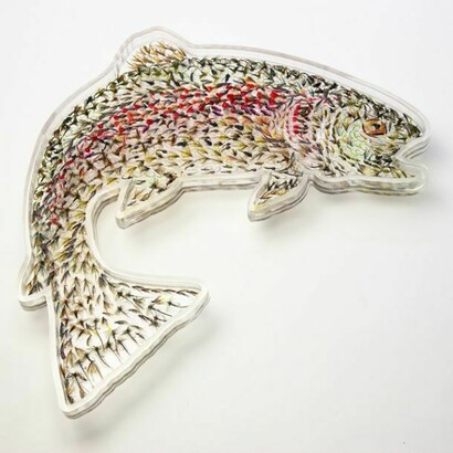 Similarly with Meagher’s trout and salmon works, the repetition of thousands of flies brings the form of the fish to life. However, the barely visible hooks belie the beauty of the flies, in the process reminding the viewer of the fate that may await the fish drawn in by the beauty and appeal of the fly.