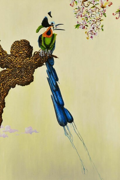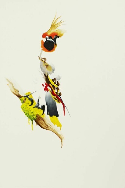 Presenting a contrasting approach to Meagher’s repetition of manmade objects, the work of young Australian artist Josh Robbins is at once spontaneous and honest. Turning to birds, blossoms, and trees for his subjects – Robbins’ fascination is one with the inherent beauty of mark-making, a reflection of the inherent beauty in Australia’s native plants and creatures. Often painting on wood, the unique marks and knots embedded in his medium guide the processes used and the end result of each work. As he explains, “I like to use the wood as wood, and then build the rest of picture around that, adding birds, blossoms and other flowers as the whim of the picture dictates.” Robbins' creative vision centres firmly around the aesthetic; whether in 'the inherent beauty of a picture' or in the exploration of the beauty of distortion. Any resulting emotional resonance only enhances the work further.