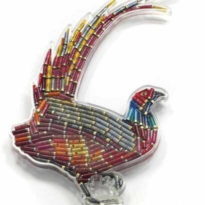 “Taxidermists strive to cover up the means and act of death, traditionally portraying the pheasant at the height of its beauty. With the shotgun cartridge works, the viewer is initially seduced by the beauty of the multicoloured cartridges that glisten in the light. However, it is hard to look past the act of death implied by all the empty cartridges, especially since these are all spent cartridges and, on looking closely, the viewer can see how some of the cartridges are coloured by gunpowder and dirt from the field.” Linton Meagher