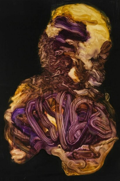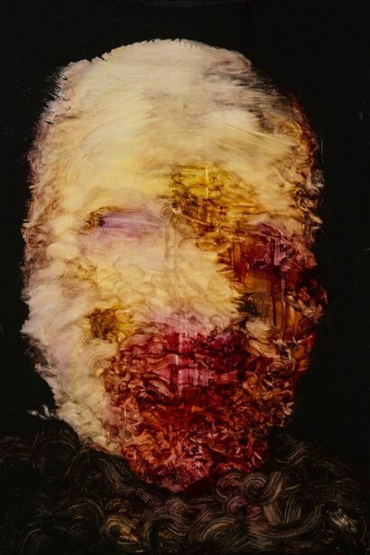 Johan Van Mullem’s painted works in ink on board are deeply personal creations that depict imagined portraits, figures, and characters from the artist’s subconscious. In his body of work, Van Mullem explores the evocative possibilities of ink, and its capacity for depth and meaning with an impressive sense of honesty and sincerity. Richly coloured pigments flow into and around each other, leaving ‘wisps of smoke’ in place of brush strokes, and bestowing the works with an anthropomorphic quality. The materials appear to be reacting and interacting with each other long after the artist’s brush has been removed. It is this combination of a unique approach to medium and an ‘unconscious’ method of painting that recasts Van Mullem’s ‘portraits’ as otherworldly apparitions. While these ‘figurative transmutations’ appear throughout Van Mullem’s oeuvre, it is only with Origin that we are finally presented with the most stripped-back version of his artistic vision.