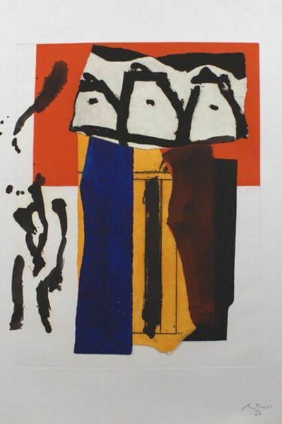 In the 1970s and 80s, Motherwell developed entire series of collages. The collage elements in these later works were often cut and torn fragments of proofs of his own prints that he embellished with gestural brushstrokes and painted compositions, and are demonstrative of his work with the torn edge. This technique of incorporating print fragments occurs in works such as The Red and the Black No. 44 (1987-1988) and Irish Book (1989.
