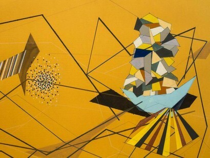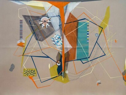 In Tegeder's project, there is a clear interplay between geometry, color, and line: fan shapes, linear trapezoids, triangular clusters, wheels of color, and shards of light intersect and overlap, with no apparent conflict or competition for dominance. These elements seem almost independent and self-sufficient, coexisting in space and interacting accordingly—much like notes in a musical score that are choreographed to harmony. The large drawings delineate a series of futuristic architectural fantasies that reimagine the modernist architecture of our urban landscape, bringing into play the visible and invisible systems of daily life. They are a continuation of a ten-year exploration of creating fictional urban cities.