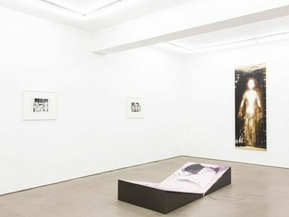 The exhibition continues with photographic works produced after this period with largescale polaroids such as ‘Whisper’ (1993), in which the artists stands soberly with the shards of a vessel shattered at his feet. The artist's continued questioning of both his own, and human, identity finds symbolic expression in the exhibitions most recent works; ‘Sweet Water, Salt Water - Romancing a Paradox’ and ‘I-con (glass of water)’, (both 2012) see the artist substitute the presence of his body with that of a single glass of water.