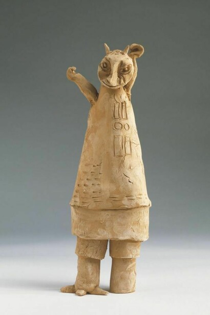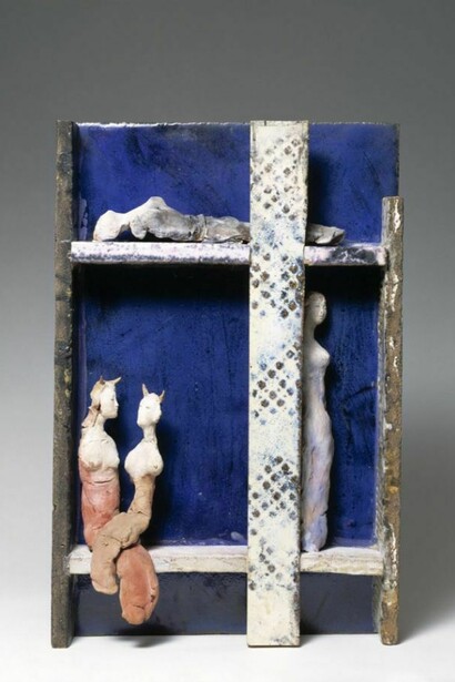 In response to the Second World War, and like many of his contemporaries, Melotti began working in a more figurative and humanist style. Works produced at this time — such as the small ceramic stage sets like Teatrino (Little theatre), c.1950 — display a greater sense of narrative compared to his earlier output; their fatalistic melancholy would endure in Melotti's later work. Like the city squares of Giorgio de Chirico's 'metaphysical paintings', Melotti's little theatres urge the viewer to bring narrative fragments to life and form a coherent performance.