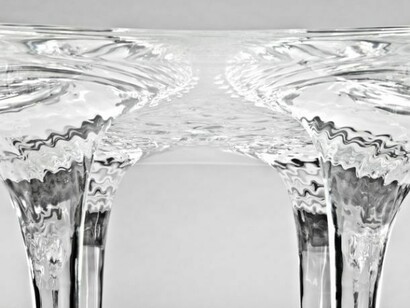 The Prototype Liquid Glacial table is dramatically visual – the flat table top appears transformed by the subtle waves and ripples evident below the surface which seem to pour into an intense vortex that forms the table legs. Like the previous Liquid Glacial tables this new table is milled and hand polished to create an exquisite finish. The design embeds surface complexity and refraction within a fluid dynamic.