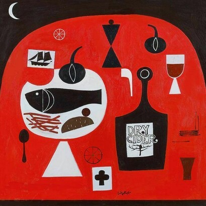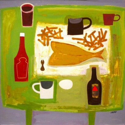 Simon Laurie is a contemporary Scottish landscape and still life artist whose paintings are characterised by references to Scottish life and society incorpor ating fish, drink, religious symbols and buildings. These objects are arranged upon a rich textural ground created by the application of multiple layers of acrylic paint. Laurie’s two dimensional construc tions combine tradition with technique to form his own fundamental visual language.