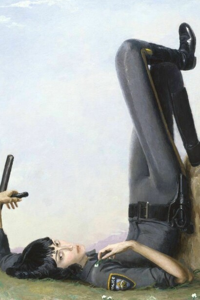 Jansson Stegner adopts tropes of Romanticism to portray contemporary longing. His female police officers crouch or lie on rocks and against tree stumps, with batons in their hands substituted for parasols, they trade their usual authoritative gaze for erotic innocence.