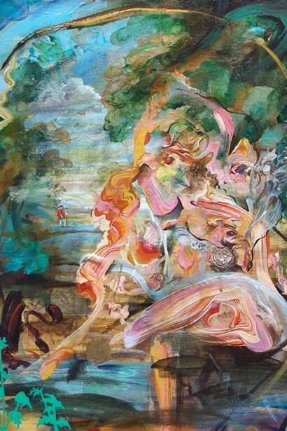 Andrews’ own artist statement discusses his “struggle to capture the relationship between the spiritual and the sensual, apparent opposites that are expressed in my work through the conflict of high narrative themes and sensuous painterly marks.” His understanding of the way in which his paintings function, clarifies the intention behind this struggle. It is a conflict he also recognises in the paintings of Soutine, who is a strong influence on his work and to whom he refers explicitly in ‘The Unlikely Pilgrimage of John Milton (Soutine’s Mount)’. It is the central importance of the materiality of paint and it’s potential for representing physical flesh that seems to attract Andrews. There is nothing ethereal about the work; no elevation of spirit over form. He is not so much interested in a theo-humanist pictorial theory - that is the representation of the divine in nature - but in the participation of humanity in re-creation.