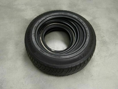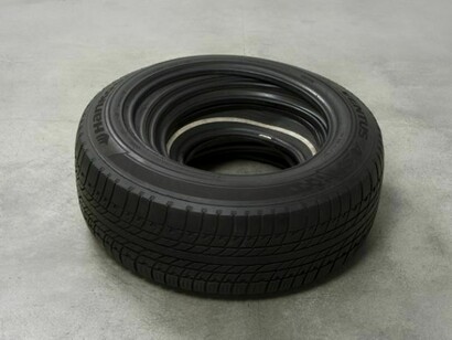 "Tour de force" consists of five used automotive tires. Forced inside one other, the tires are condensed into an extremely reduced space. Their physical density forms an accumulated mass that suggests a peculiar re-invention of the wheel. Approximately 280 million tires are discarded by American motorists each year.
