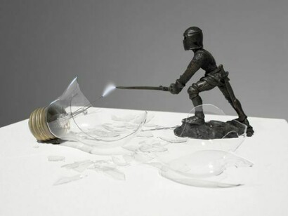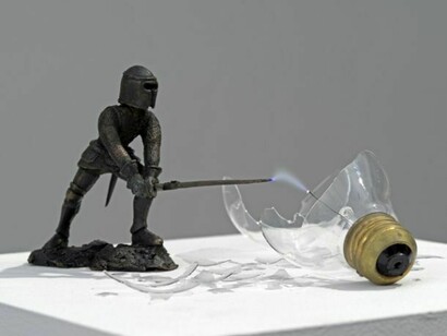 "Overpower", de Broin's latest work to date, playfully examines electrical energy as metaphor for the technological unconscious. A small bronze cast figurine, a knight bearing a sword, pulses with 10,00 volts and ignites a broken household light bulb. Sparks fly as the characters fight off obsolescence, in an age-old battle between faith and reason.