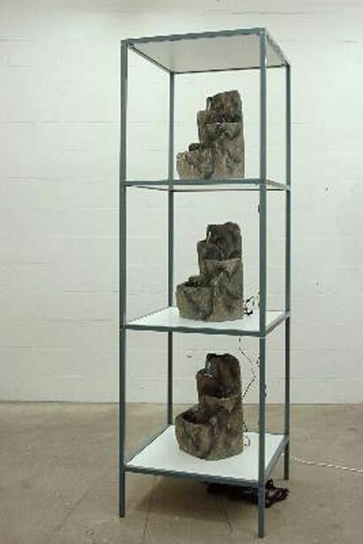 Helen Maurer 's Glass Fountain consists of two drinking glasses placed on top of each other, rotating slowly on a turn-table. They are lit to produce moving drawings on the wall, reminiscent of water, smoke or biological specimens.