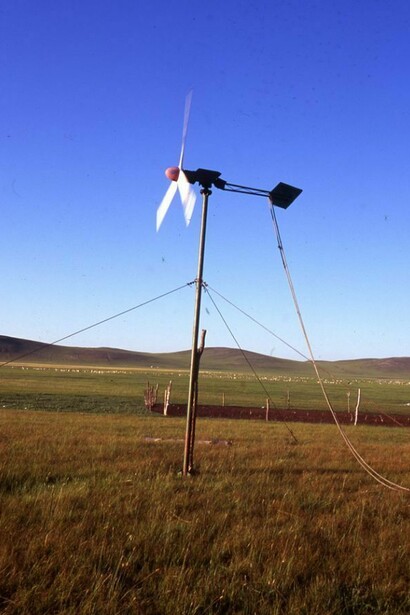 In Sophie Lascelles 's installation In the grasslands a 16 mm film projector and a slide projector merge images on to an unfolded cardboard box. Depicting a lone windmill in the grasslands of Inner Mongolia, the single image emphasises the relationship between the movement of the windmill blades and the projector shutter and rhythm.