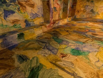 Enli always paints with artificial light in a studio located in Moganshan Road art district, an industrial compound filled with galleries and artist studios in Shanghai. Looking at the tones and colours that permeate his work this lack of natural light is evident and enhances the presence of an artificial atmosphere. Enli’s work embodies a very personal relationship with his surroundings and for the ICA he aims to stretch colours across the space 'like human skin' with thin washes of pigment creating a 'space painting.'