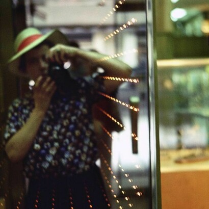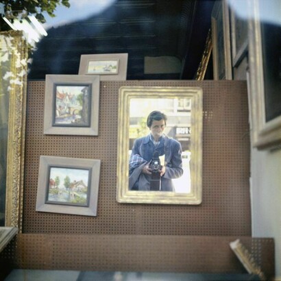 Vivian Maier: Self-Portrait at Howard Greenberg Gallery is the first exhibition to explore the photographer’s numerous self-portraits and the first U.S. gallery exhibition of her color work. Among the highlights is an untitled image from 1950 showing a young Maier with her short cropped hair and no make-up reflected in a framed mirror hanging next to several landscape paintings in an antique store or flea market. She looks professional in a blue jacket with a trench coat draped over one arm, a camera hanging from her neck.