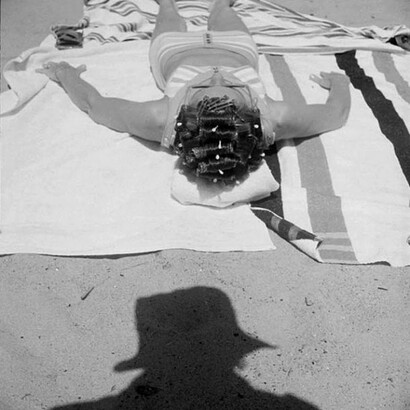 Another reflection of Maier, Anaheim, California, September 10, 1955, shows her profile surrounded by darkness: she looks almost elegant, yet vulnerable, in a small round mirror she appears to be holding. An untitled photograph from 1959 is more revealing, as Maier’s image almost fills up the frame, showing her pixie haircut and a serious expression. Other self-portraits show Maier in shadow: one from 1954 shows her shadow cast on a beach; another beach shot shows Maier’s head with her signature man’s hat, her shadow looking almost ominous next to a woman sunbathing in a bikini.