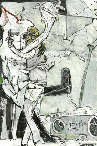 It does not feel like a rational, organized universe, but rather one in which everything is in freefall perspective, scale, objects with an almost manic force running the show. However, the composition and line keep everything under control and balance within the canvases. There are echoes of Grosz, Klee, Ensor.