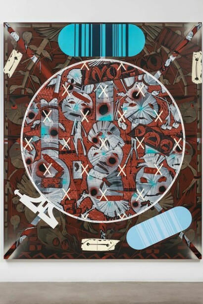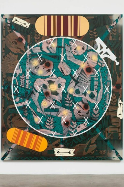 The centerpiece of the exhibition features three mural-sized paintings. Entitled Flying Carpet with a Waning Moon Over a Violent Nation; Flying Carpet with Magic Mirrors for a Distorted Nation; and Flying Carpet with Petri Dishes for a Disturbed Nation; the works combine meticulously detailed and multi-layered imagery that is at once heavily abstracted and referential. Tropes of violence and devastation are 'woven' through the canvases, in the manner of a tapestry or elaborately constructed rug. Pittman interlaces weapons, architectural schematics, and skewed portraits within this web. These three propositions encourage a navigation of varying perspectives—whether through the telescopic crosshairs of a rifle lens, or in the blank reflections of hand-held mirrors, or among molecular cultures in a petri dish—that resist facile readings or easy identifications.