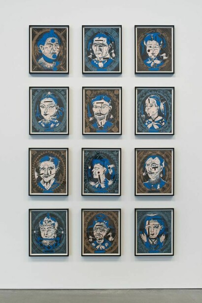 Taking a cue from the titles of the large "Flying Carpet" paintings, the various sets of works on paper ask us to contemplate the current moment, with historical precedents in mind. Every nation needs an anthem, and the suite of drawings, New National Anthem and Lamentation Duet with Birds (After Puccini) is comprised of eight brightly-hued portraits overlaid with the renowned aria from Puccini's Tosca, "Vissi d'arte, vissi d'amore." As a highly pitched and arch lament, this series of drawings rails against fate, loss, betrayal, and injustice. Other series of drawings in the exhibition demonstrate Pittman's dexterity and range, his ability to glean images from across centuries and cultures and then re-present them as works on paper with a distinct bravura. Twelve Fayum From A Late Western Impaerium (After Hermenegildo Bustos) references Coptic mummy masks (Fayum), and 19th century Mexican portrait paintings of the middle-class. Set Arrangements of Ballet Mécanique for a Fossilized Nation (After Léger) evokes Dada, chaos, sound, and film. Other series of drawings in the exhibition take up contemporary elements, simultaneously suggesting an almost nostalgic nod to the past. What unites all of these works, however, is something more timeless: Pittman's singular agility as an artist and draftsman.