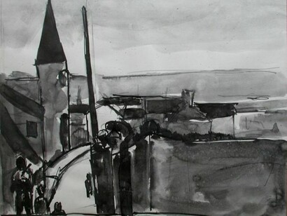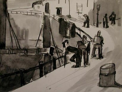 - Josef Herman 1911-2000, Port scene, 1948, Pen, ink and wash on paper, 8 x 10 in, 20.3 x 25.4 cm