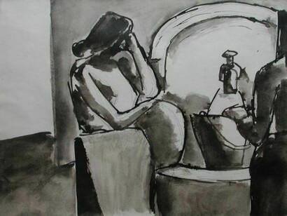 - Josef Herman 1911-2000, Woman at the water tap, 1955, Pen, ink and wash on paper