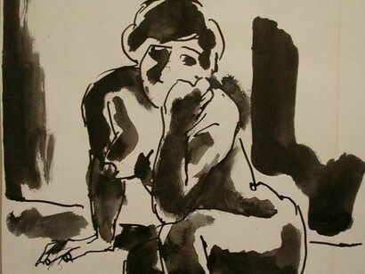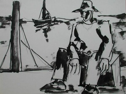 - Josef Herman 1911-2000, Seated fisherman on shore, 1960, Pen, ink and wash on paper, 8 x 10 in, 20.3 x 25.4 cm