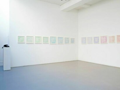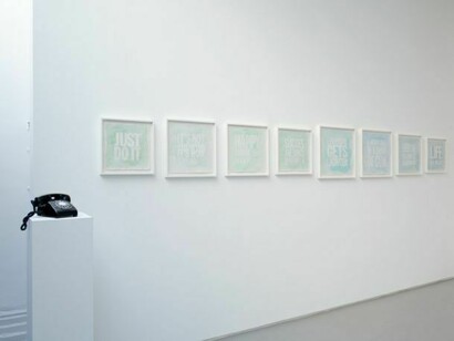 In the Poem Paintings, Giorno transposes punchy sentences from his own poems onto paper in bold, white capital letters reminiscent of newspaper headlines - a font that he developed with a graphic designer, and has been using since 1984. The words are set off against painterly backgrounds of pasteltoned washes of colour. The viewer both reads and looks at the charged sentences like thanks 4 nothing or just say no to family values, engaging with the poem on two different, simultaneous yet exclusive levels. Giorno provides a visual and narrative anchor by presenting the watercolours in a sequence that follows the chromatic spectrum: from yellow to blue to green, a poetic narrative is developed through purely visual means. In these works thus, painting becomes a vehicle for poetry.