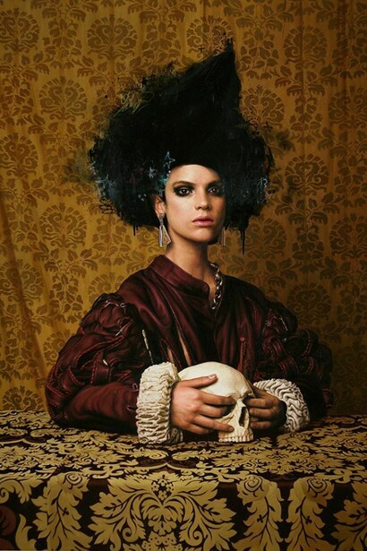These contemplative beauties are adorned in clothing combining Reformation- era fashions with classic street style – including an MA 1 bomber jacket.