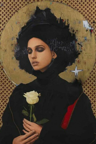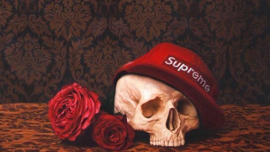Nine large canvases depicting striking female figures, painted in oils, acrylic and spray paint, dominate the exhibition. A corresponding selection of still life pieces works demonstrate his skills at the easel and grasp of contemporary culture, featuring for instance a skull wearing a cap from cult NY street wear label Supreme.