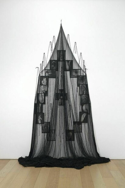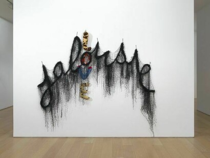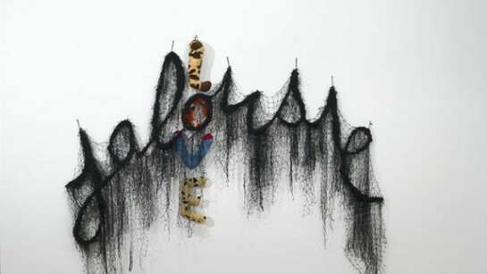 A material broadly used by the artist, which has become a significant feature of her plastic vocabulary is the net. Although composed of holes, a net has the capacity to capture, restrain and confine. For Annette Messager the net both conceals and reveals as in reality it is used to retain elements while letting others slip through. In works like Spaaasm και Jalousie/Love the artist uses the net to formulate words.