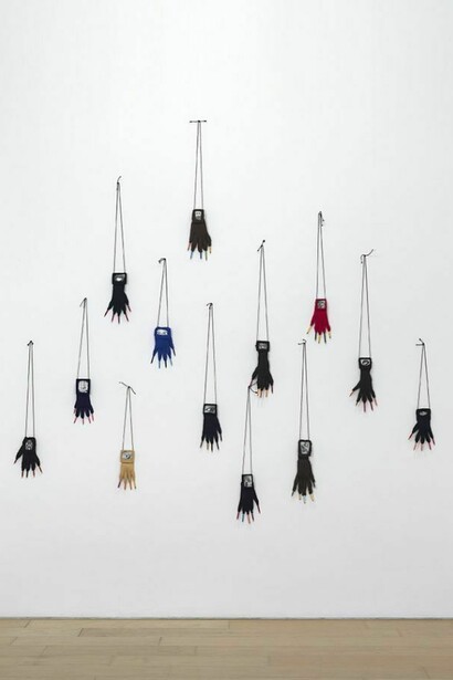 The artist developed compositions made up of gloves broadly in the end of the 90’s. -lIke Grimace- Gloves (Gants Grimaces) or The Burning Bush (Le Buisson Ardente )-, Sometimes from these gloves, protrude colour-pencils, another object that features in her pieces. Messager uses pencils like minuscule spears, like needles, or prickles that pierce the soft materials of gloves, stockings or stuffed animal toy parts. The ordinary tools of writing and drawing are transformed by the artist into weapons of attack or defense, with a somewhat comic character and an indisputable, underlying sexuality. The coexistence of cruelty, violence and funniness is evident in Annette Messager’s works. Funny and cruel are merely two sides of the same coin, as if deriving from the fairy tales that once used to frighten and amuse us.