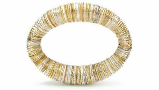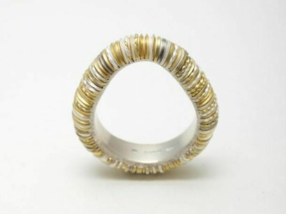 Andrew also finds inspiration in the linear patterns and structures abundant in nature and woven textiles. With these in mind, he uses a combination of fine lengths of 18ct gold and silver wire to construct sculptural, three-dimensional jewellery. The wire, layered, twisted or overlapping to create pieces with rippling textures and subtle colour variations playfully drawing in the eye and creating a moment of surprise.
