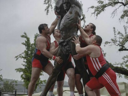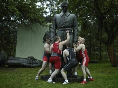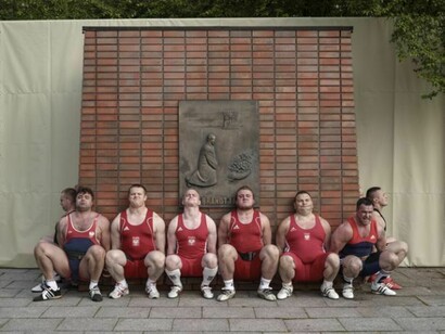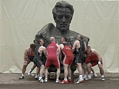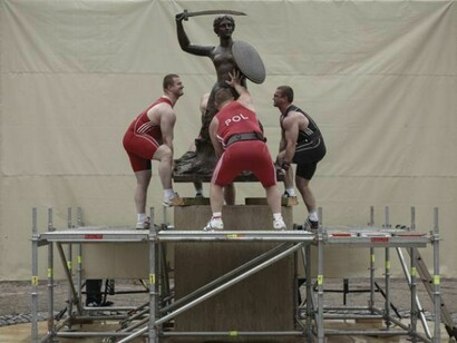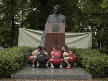 Last year the German artist Christian Jankowski travelled to Poland to produce Heavy Weight History, which consists of an installation, a 25-minute film and a series of photographs. Jankowski invited a group of burly weightlifters to try and pick up a number of massive public sculptures in the Polish capital of Warsaw, including more than one Communist-era memorial, a statue of Ronald Reagan and the figure of Syrenka the Mermaid, a famous, often vandalised symbol of the city, first erected in 1859. Wearing their national colours, the Polish champion powerlifters and benchpressers struggle and strain to elevate these hefty bronze and brick monuments, metaphorically attempting to lift the very burden of history on to their shoulders.
