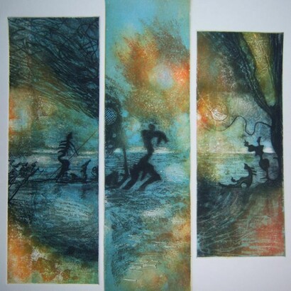 Annabel Wyllie: She first studied mosaics then watercolour and oil in Barcelona before moving back to England and starting printmaking in 1995. From this background she has developed a complex method of printing using many plates and creating layers through the devices of stencil, monotype and chine colle. These multi-layered images with classical and literary illusion hope to convey an intangible essence of the past and a glimpse into a mysterious and ancient world.