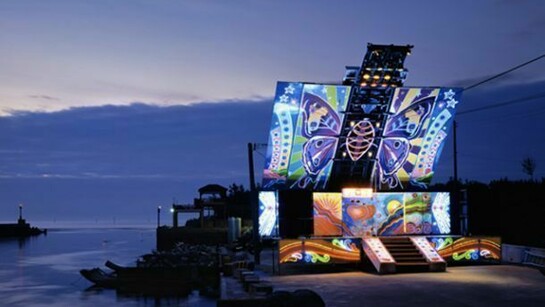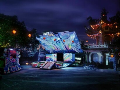 Shen Chao-Liang made over 100 photographs between 2006 and 2011. In his introduction to his book, Stage, the artist explains his fascination with these stage trucks, their history, how they are made, and the life that surrounds the performers and business owners. The artist followed many stage trucks to remote areas on the island, stopping on side roads, industrial zones, at seaports, rice paddy fields and in front of Temples. Since the 1970’s, performance groups, singing and dancing at weddings, funerals and other festivities have been part of Taiwanese culture. These highly designed, unfolding stage trucks provide the settings for the musical shows, flaunting a magical array of lights, colors and symbols that represent the values and spirit of Taiwanese culture.