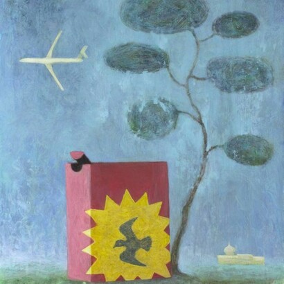 The recurrent elements in his artistic landscape have gained an almost symbolic force. Wallace himself calls them 'absurd icons'. Birds act as mute witnesses to the unfolding scene. A mysterious dog reappears at intervals - now red, now blue- an elusive but essentially benign presence. The human figures that inhabit his curious landscape are touched by its oddness. Sometimes they are completely overwhelmed by their surroundings.