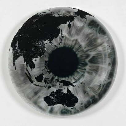 The Eye of History paintings (2012-ongoing) are a series of works that depict human irises on a magnified scale, with maps of the world superimposed upon them. These works attempt to navigate the interaction between man and the planet. For example, in The Inner Eye (Beginning of the Ice Age)(2013), the land mass is painted white as if it were a drifting iceberg, perhaps addressing the debate on how man-made energy sources are constantly impacting on the already shifting surface of the planet.