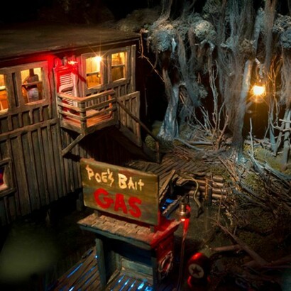 Equally engaged in narrative idioms, Tracey Snelling’s new sculptures and assemblages are influenced by old horror films, true-crime TV shows, and island voodoo who-done-its. Mystery Hour invites viewers into another dimension; sculptures of haunted houses and damsels in distress are illuminated by glowing, sinister neon words while a large projection of a nighttime island mystery looms behind three-dimensional tropical seams of mayhem. Rum and whiskey will be offered from a life-size swampy Tiki-bar. Large-scale posters, movie displays, and a billboard eerily announce the horror and suspense thrillers that never existed…but do now.