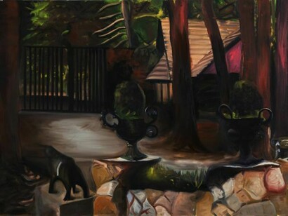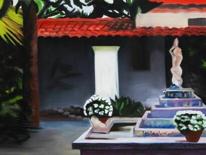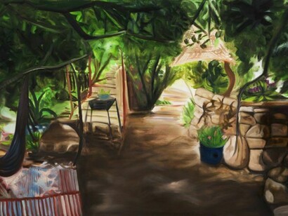 The paintings display gardens, courtyards and surroundings of private houses. In Frontier, Ben Moreh continues her investigation of defining the private space, domesticity and the seam between the inside and outside.