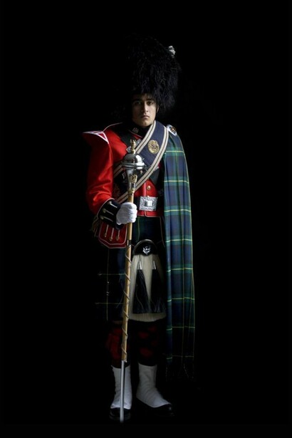 She was particularly fascinated by subjects with all-over tattoos – with “magic texts,” as she called them, thus echoing a phrase from Frazer’s opus. In addition, she might ask young people to pose for her, clothed only in scraps of antique lace, necklaces of paper doilies, shuttlecocks or white mice, even with epaulets of dripping candles. More recently, she has created three studies of young men with body painting that imitates the blueand- white “Musselmalet” pattern introduced by Royal Copenhagen Porcelain in the 18th century but loosely derived from Meissen’s blue-and-white onion pattern. The slender figures of the three young men who “model” the cobalt-blue ornamentation have a touching fragility – like fine porcelain itself. (They are also a reminder that among tribalist cultures body painting frequently accompanied rites of passage, hunting and warfare.) The delicacy of the “Musselmalet” figures is even more dramatic if compared to the rugged cadets, in full Scottish dress regalia, who make up the series entitled “White Crowned Sparrow.” (As pupils at a Canadian boarding school, the cadets depicted here suggest that the outward trappings of ritual can also be effectively “transplanted.”) What such works have in common and share, indeed, with the portraits of Deaconesses in crisp white caps and bows is that all the protagonists wear a sort of uniform. That uniform, in turn, signifies shared values and goals. Far from suppressing individual identity, here the uniform actually enhances it. In the case of Klinke’s startling portraits of “Bee Kings,” the helmet worn is not only alive but also potentially lethal.