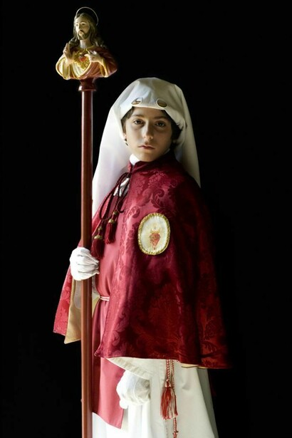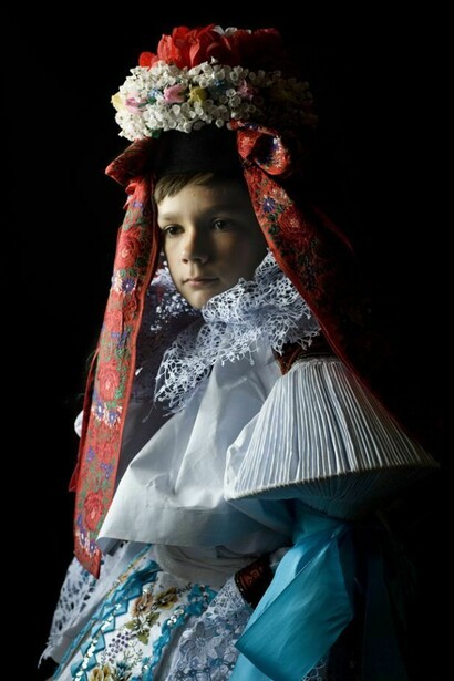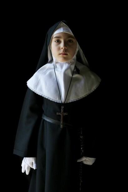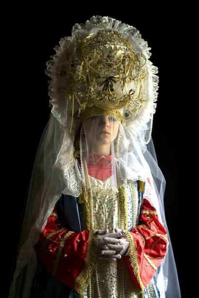 While Klinke has also produced theatrical studies of young people with bizarre accessories or in the contemporary “costumes” of fencers and American-style footballers, her signature pieces are studies of children dressed in elaborate traditional garb, often richly embroidered. For these studies the artist only works within the context of the religious ceremonies in which such attire is actually employed. There is no studied “posing” or extra dressing-up. This, she feels, would undermine the authenticity she seeks. Often a project may seem a race against time, since the use of a particular elaborate headdress in a single mountain village may be the last, fragile vestige of ancient ceremonies otherwise forgotten. Such work has an obvious documentary dimension, though Klinke sees this as secondary. “I don’t choose subjects for their anthropological value,” the artist insists. “I choose them for their beauty.” Nonetheless, the search for a motif may well involve considerable research and cross-cultural savvy. Serendipity, however, can also play a role – as in the recent discovery in Toronto of old-fashioned display mannequins wearing “communion suits” and lace ribbons bearing the name “Jesus” alongside a chalice.