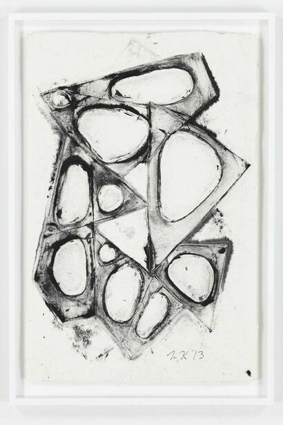 Kendrick describes and often makes his works on paper in sculptural terms. For the past year, he’s been pursuing what he calls “Water Drawings,” a series of cast-paper drawings comprising two 40-by-60-inch sheets created at Dieu Donné papermaking workshop in New York. A black pigment-coated mold is pressed into a soft mass of wet pulp, and under the force of the press the pigment spreads into the paper and binds with it.