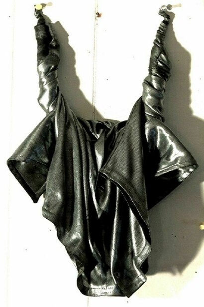 In Jürgen Klauke’s Durchlauferhitzer (2003), the artist lies beneath a table that is penetrated by two balloon-like bags that hang unevenly from above. Outgrown for this childhood hiding place, the presence of an outer force is immediate and besetting. It’s a dream-and-mind game turning contemplation on the every individual’s life designation into social hells and heavens. Austin Lee creates digital renderings, which he then translates into the physical media of painting, jarring the organic with digital rules and order. Out of Love (2013) portrays a candy colored couple laced with the obscure traits of their self-conjured nightmare. In its monumental, visceral vignette, portraying the human experience, Out of Love acts as comedian with a hysterically sick laughter. Three articles of clothing are twisted, deformed and suspended from the wall.